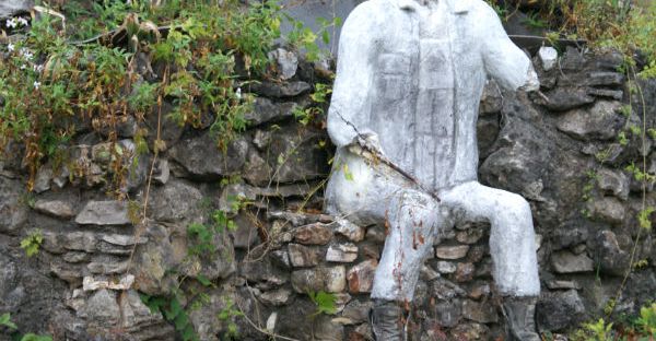 On our Route 66 honeymoon, Sweetums and I were taking a detour looking for the ruins of an old roadside resort in Jerome, MO. (We found it. More on that later). We were surprised to see a headless concrete figure of a man beside Highway D and quickly turned around to see what was hidden in the overgrowth beyond it. We’d stumbled on the ruins of Larry Baggett’s Trail of Tears Memorial, made largely of rocks and concrete. Before he died in 2003 at the age of 78, Baggett had created a large and detailed memorial, as you can see on a Facebook page managed by his grandson. Unfortunately, the elements have taken their toll and not much remains of the memorial.