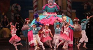 For those unfamiliar with the story, Mother Ginger is “mother” to lots of gingerbread children, little dancers who emerge from beneath a massive skirt that, in his case, was made to look like a gingerbread house. Mother Ginger is also, traditionally, played by a man. Sweetums had to shave his beard, which he never does, and wear a hot-pink bouffant wig. It really turned out to be a good look for him.