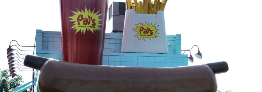 Sweetums and I finally got to see a Pal's drive-through restaurant when we were on our way to the mountains recently. We stopped in Kingsport, Tenn., specifically to see the giant hot dog, fried and cola atop their building. We didn't get to eat there but it was as adorable as we thought it would… Continue reading Have a giant burger and Frenchie fries at Pal’s