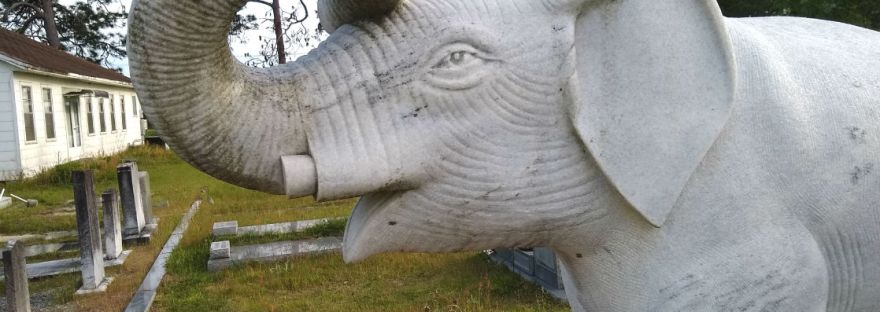 Last weekend, Sweetums and I were traveling around southern Alabama and Georgia taking photos for my upcoming Guide to the Quirky South (The History Press). I had several places on my list that I had never visited, including the abandoned school that serves as Hawkins Middle School in “Stranger Things.” (More on that coming soon).… Continue reading This grave in Georgia is marked by a life-sized baby elephant statue