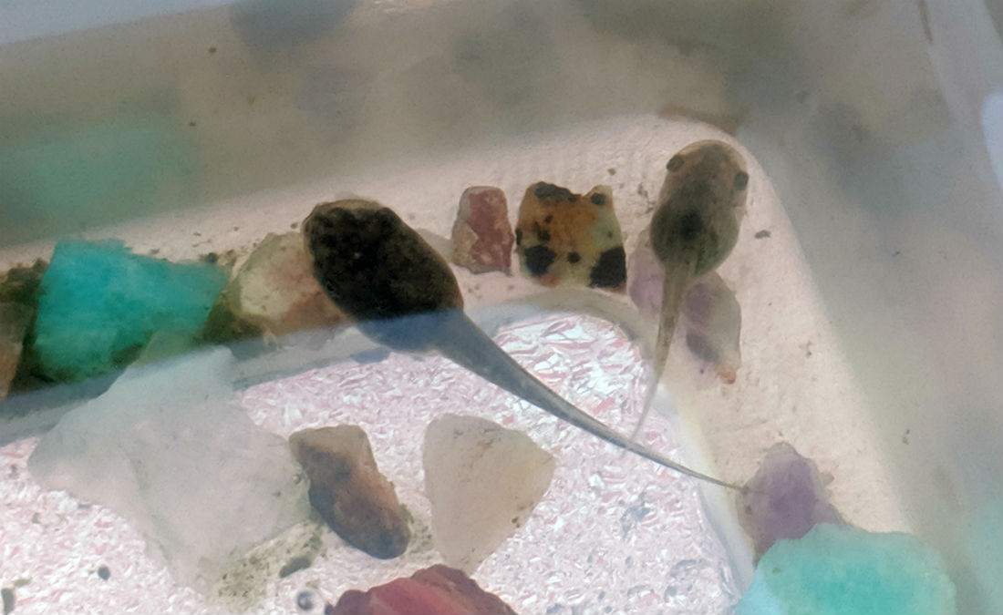 Then, last month, I discovered a new side to Sweetums. While cleaning my adult kiddie pool for the season, I noticed four tadpoles. They were tee-tiny so I scooped them up with a spoon and placed them in a plastic container. After work, I asked Sweetums if he would re-home them in a nearby creek. Instead, he started googling “how to raise tadpoles.” Just like that, we had four new “babies.”