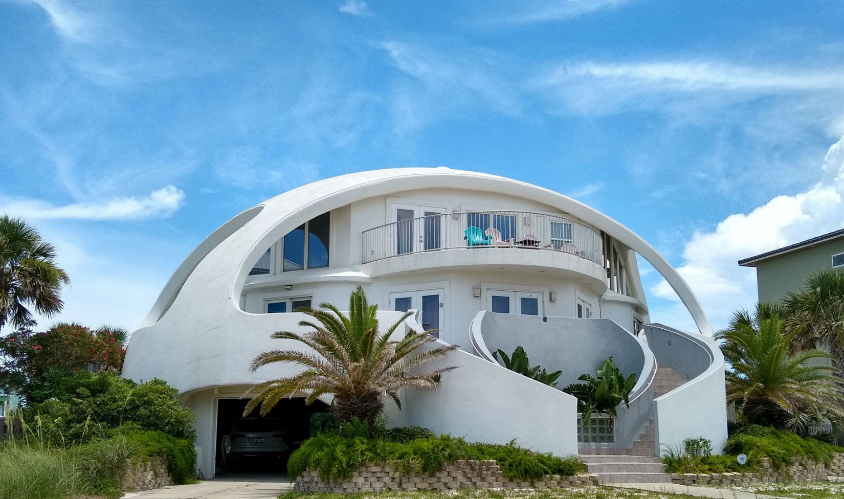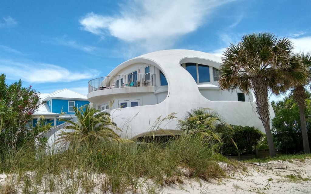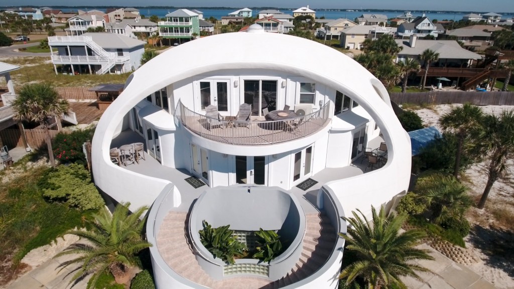 Paradise Beach Homes says, “The geodesic Dome Home was built in 2003, and is a solid concrete and steel, aerodynamic ‘hurricane-proof’ home, a veritable fortress. This fabulous Pensacola Beach home is famous. The monolithic structure has been featured on HGTV’s ‘Amazing Vacation Homes,’ The Weather Channel’s ‘Storm Stories, Ivan vs the Dome Home,’ the Discovery Channel and the Travel Channel. The NBC News weather team rode out Hurricane Ivan safely in the Dome Home.”