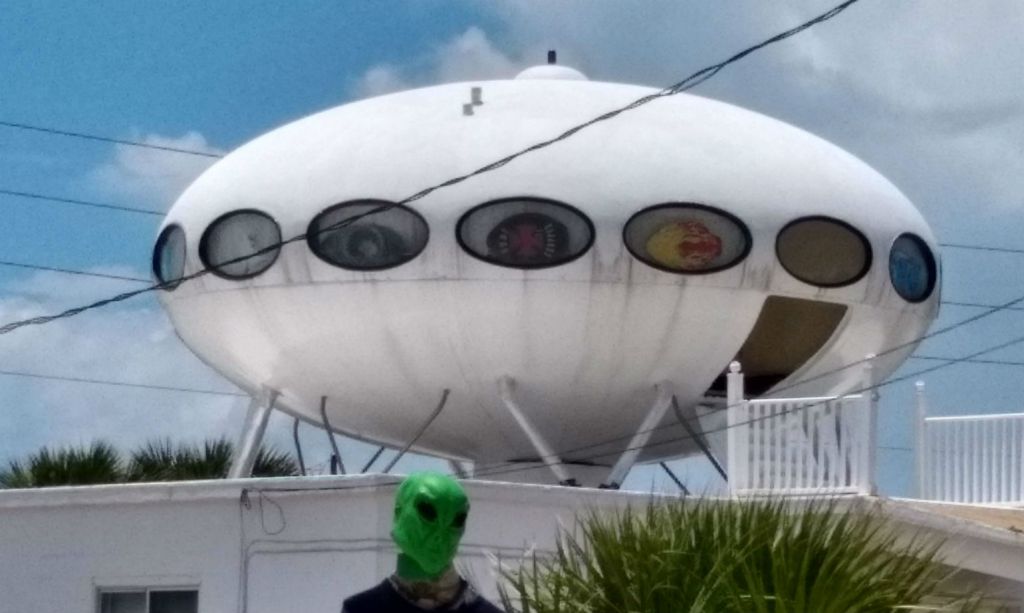 A neighbor erected a mannequin in an alien mask to provide a touch of whimsy (and patriotism). The homes were designed to withstand hurricanes and the one on Pensacola Beach has survived several. Only about 60 of the homes survive in the world.