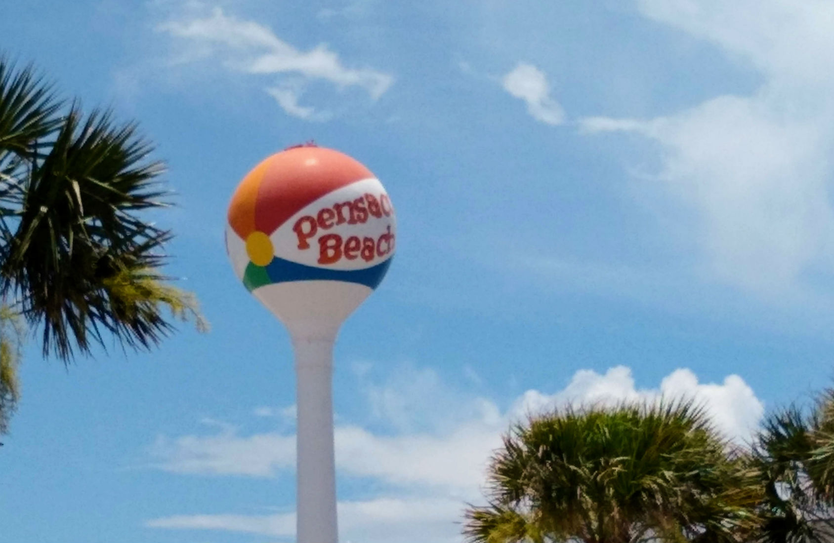 The beach ball is actually a water tower on Pensacola Beach painted in bright colors.