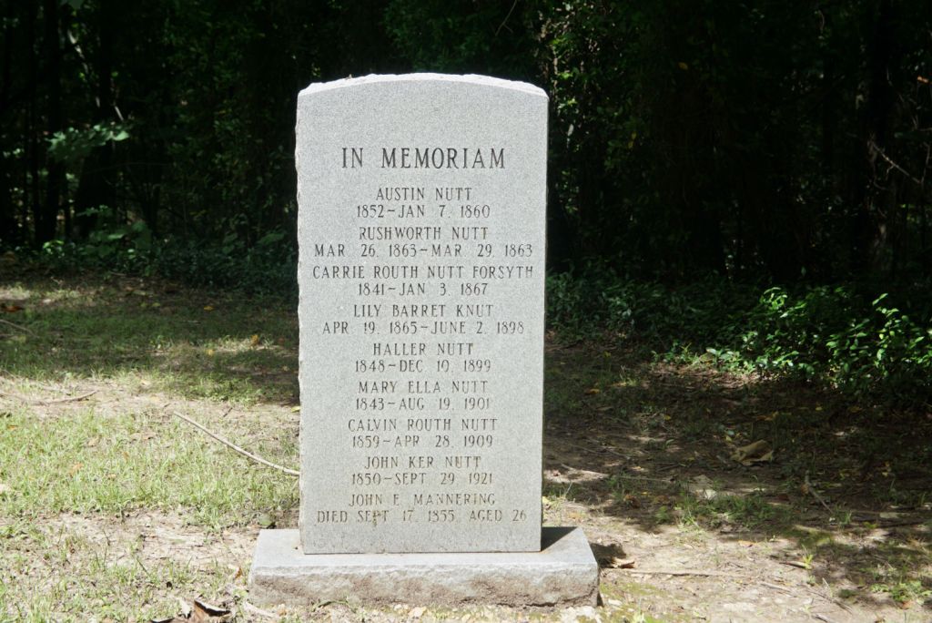 The octagonal home was begun in 1858 by Haller Nutt. The exterior and basement were completed when the Civil War began and the family lived in the basement beneath six unfinished stories.