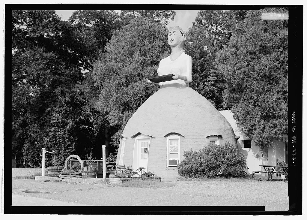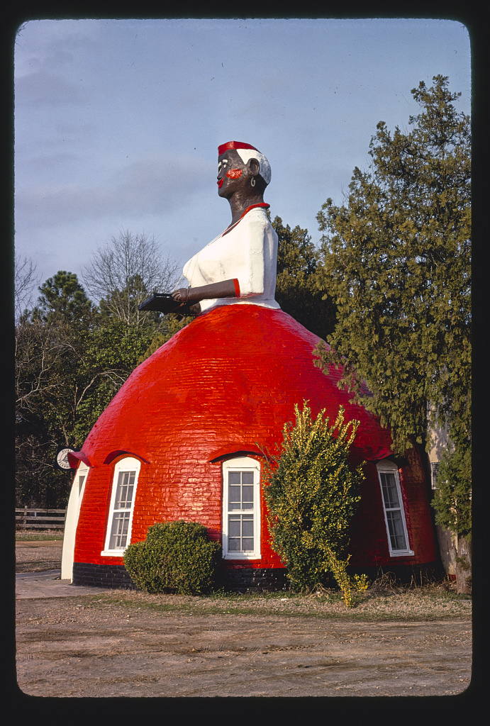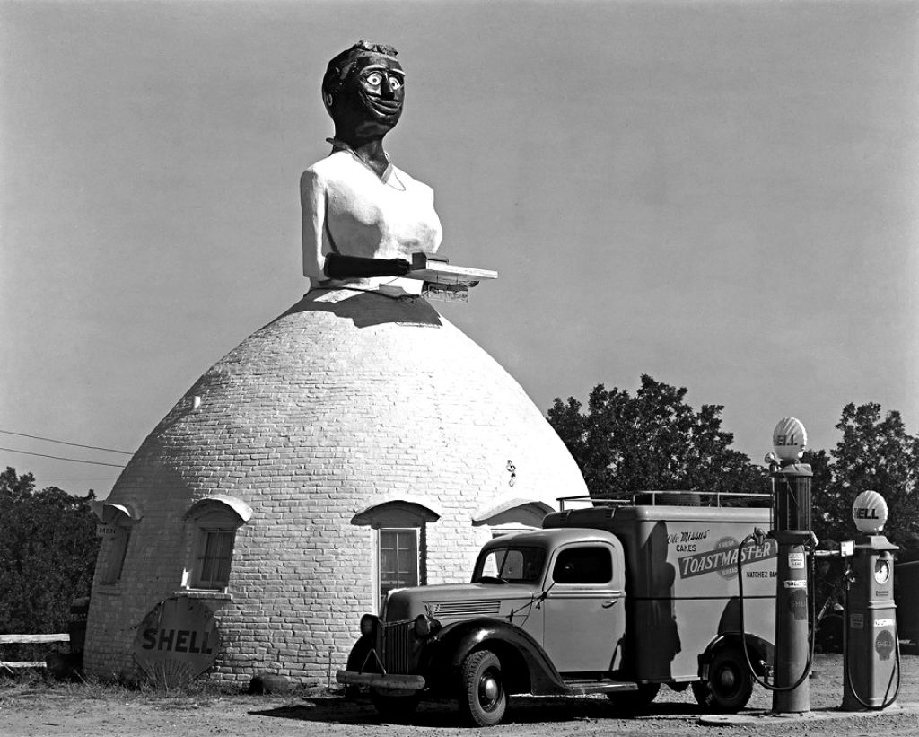 The restaurant was built by service station owner Henry Gaude in 1939. He wanted a way to pull motorists from the highway and at that time, of course, “Gone With the Wind” was the hottest movie in the nation. According to RoadsideAmerica.com, she may have been intended as more of a Scarlett, a white Southern belle, designed by Annie Davis Best, whose husband was a local architect. Henry, however, seemed to feel a black mammy offered a more appealing and nurturing face for a diner. At the time, “mammy” had positive connotations of nurturing and warmth, although in the subsequent years, the stereotype took on negative aspects of enslavement and servitude.