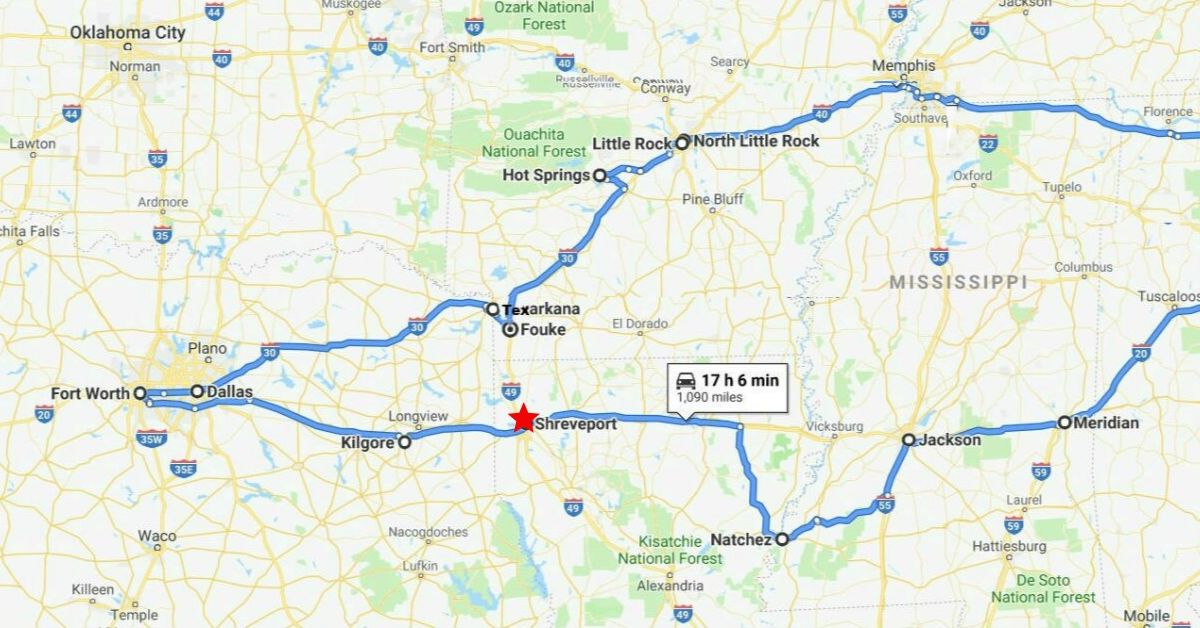 From Sunday, July 21 through Friday, July 26, Sweetums and I drove 2,150 miles from Huntsville, Alabama, to Fort Worth, Texas, and back again. I am posting the stops in order of the trip. The map is below. Most sites will be included in my upcoming Guide to Southern Oddities.