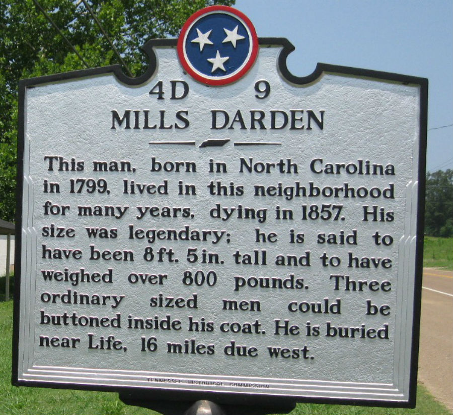 Mills’ entry in the 1892 volume of Appleton’s Cyclopaedia of American Biography stated: “DARDEN, Miles, giant, b. in North Carolina is 1798; d. in Henderson county, Tenn., 28 Jun., 1857. He wits seven feet six inches in height, and at his death weighed more than one thousand pounds. Until 1838 he was active, energetic, and able to labor, but from that time was obliged to remain at home, or be moved about in a wagon. In 1850 it required thirteen and is halt yards of cloth, one yard wide, to make him as coat. His coffin was eight feet long, thirty-five inches deep, thirty-two inches across the breast, eighteen across tie bead, and fourteen across.”