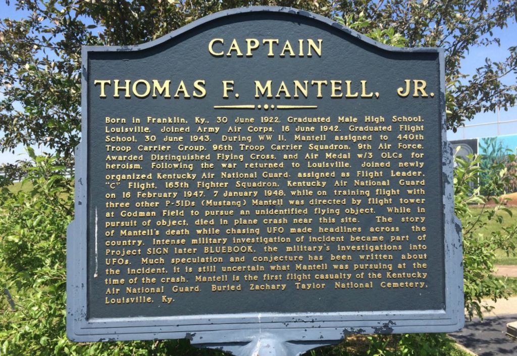“Captain Thomas F. Mantell. Born in Franklin, Ky., 30 June 1922. Graduated Male High School, Louisville. Joined army Air Corps, 16 June 1942. Graduated Flight School, 30 June 1943. During WWII, Mantell assigned to 440th Troop Carrier Group, 96th Troop Carrier Squadron, 9th Air Force. Awarded Distinguished Flying Cross, and Air Medal w/3 OLCs for heroism. Following the war returned to Louisville. Joined newly organized Kentucky Air National Guard, assigned as Flight Leader, “C” Flight, 165th Fighter Squadron. Kentucky Air National Guard on 16 February 1947. 7 January 1948, while on training flight with three other P-51Ds (Mustang) Mantell was directed by flight tower at Godman Field to pursue an unidentified flying object. While in pursuit of object, died in plane crash near this site. The story of Mantell’s death while chasing UFO made headlines across the country. Intense military investigation of incident became part of Project SIGN later BLUEBOOK, the military’s investigations into UFOs. Much speculation and conjecture has been written about the incident; it is still uncertain what Mantell was pursuing at the time of the crash. Mantell is the first flight casualty of the Kentucky Air National Guard. Buried Zachary Taylor National Cemetery, Louisville, Ky.”