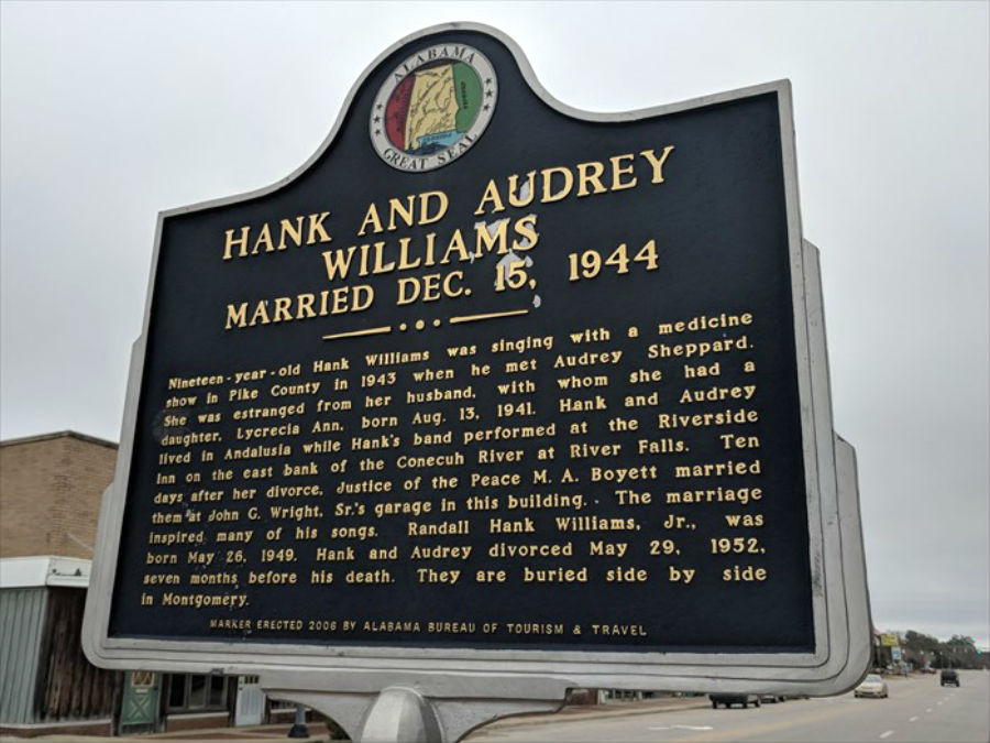 Nineteen-year-old Hank Williams was singing with a medicine show in Pike County in 1943 when he met Audrey Sheppard. She was estranged from her husband, with whom she had a daughter, Lycrecia Ann, born Aug. 13, 1941. Hank and Audrey lived in Andalusia while Hank’s band performed at the Riverside Inn on the east bank of the Conecuh River at River Falls. Ten days after her divorce, Justice of the Peace M. A. Bovett married them at John G. Wright, Sr’s garage in this building. The marriage inspired many of his songs. Randall Hank Williams, Jr, was born May 26, 1949. Hank and Audrey divorced May 29, 1952, seven months before his death. They are buried side by side in Montgomery.