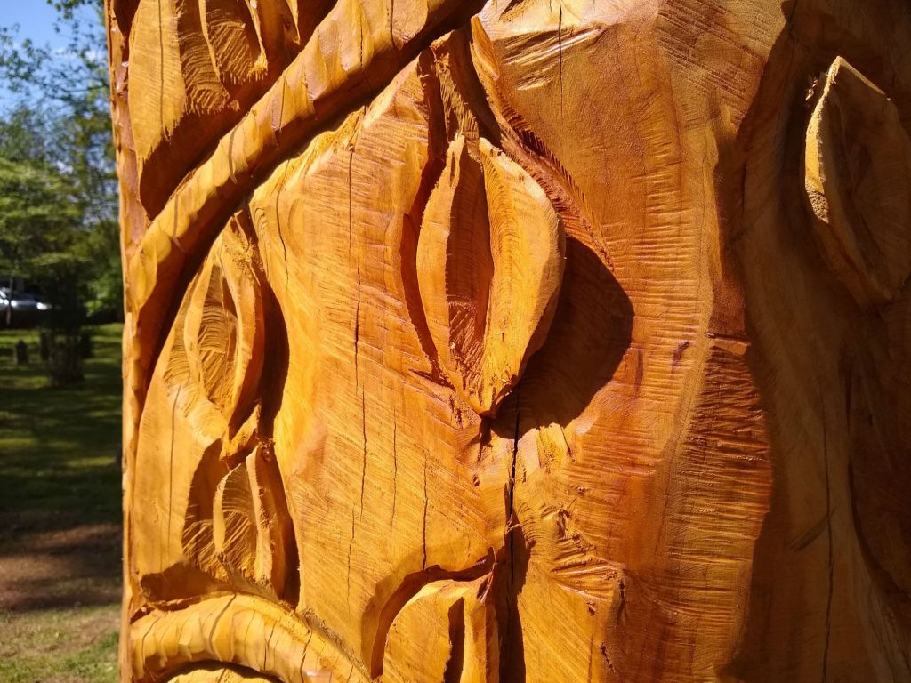 On this day, however, we came across a new piece of art. According to Cemetery Director Joy McKee, who was interviewed by WHNT, the tree had been damaged by storms and was no longer safe. Rather than cutting the tree down completely, the city hired Tennessee artist Roark Phillips to carve the trunk into beautiful vines of ivy. Check out our photos below.