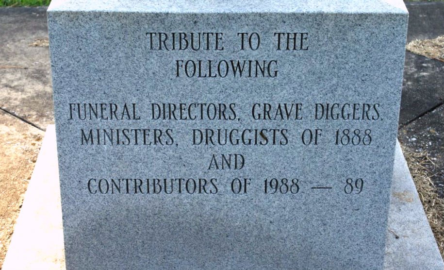 Tribute to the Following: Funeral Directors, Grave Diggers, Ministers, Druggists of 1888 and Contributors of [erecting the monument] 1988-89.