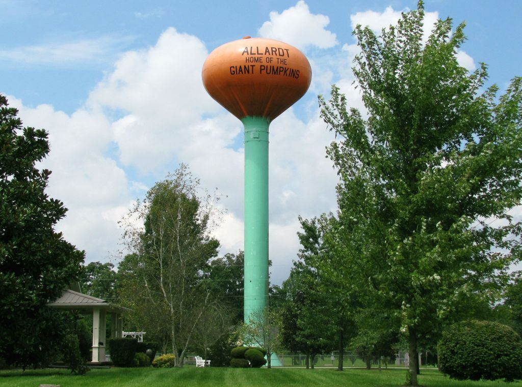 We were passing through on a short road-trip when we noticed a really cool water tower in Allardt and, of course, had to turn around and take photos. The orange bulb of the tower is stenciled with “Allardt: Home of the Giant Pumpkins” and the “stem” is painted green.