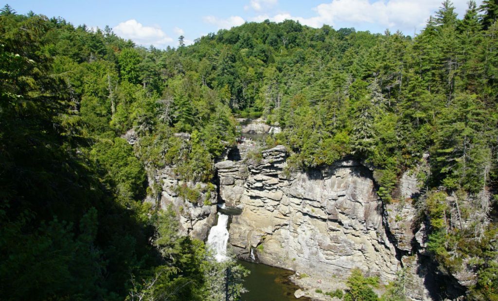 The North Carolina tourism bureau says: “It is a spectacular three-tiered waterfall plunging into Linville Gorge, the ‘“Grand Canyon of the Southern Appalachians.”’ The Falls Trail distance is 1.6 miles round trip and easy. The Gorge Trail distance is 1.4 miles round trip and strenuous. The Plunge Basin Trail is 1 mile round trip and moderate.”