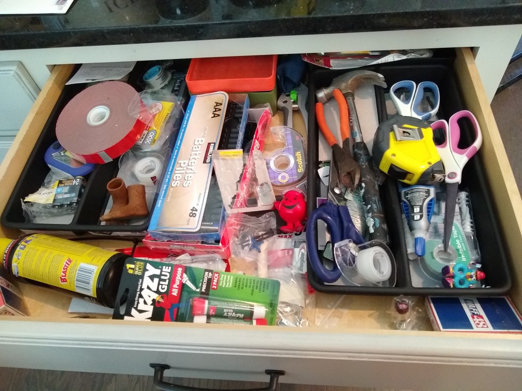 Not long after we moved, I ordered a couple of plastic organizer trays from Amazon so I could start life in our new house with a nice, neat “junk” drawer. It would be so neat, in fact, we could rename it – perhaps calling it a necessities drawer or, if we wanted to get fancy about it, maison de nécessités, home of the necessities. (Everything is fancier in French. I think it’s the little accent thingies).