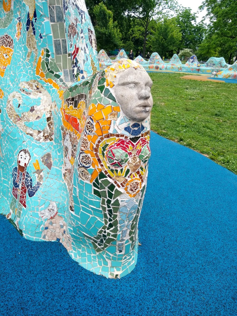The largest serpent makes an oval in the center of the park; a smaller serpent arches over the larger one. The art installation was renovated a few years ago. A colorful rubber floor surrounds it so that children can play on a soft surface.